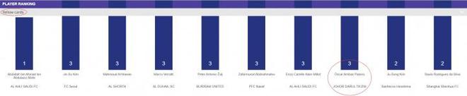 原来亚足联的官网显示,柔佛新山的后卫阿里巴在赛前就已经累积黄牌三张(下图)。按照规则,本轮对阵海港时他应该停赛无缘出场。然而这场对阵海港的比赛,他踢满全场表现积极,为打平海港立下功劳。